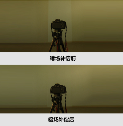 投影機(jī)的漏光,是指投影圖像為全黑色的時(shí)候,投影機(jī)仍舊有一部分光線能投射到投影幕上。這樣兩臺(tái)投影疊加以后,在純黑場(chǎng)的時(shí)候會(huì)出現(xiàn)一個(gè)中間亮帶。融合器需要用提升非疊加部分光強(qiáng)的方式,來抵消亮帶,這一個(gè)過程為暗場(chǎng)補(bǔ)償。