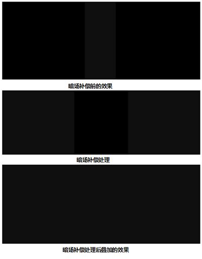 投影機(jī)的漏光,是指投影圖像為全黑色的時(shí)候,投影機(jī)仍舊有一部分光線能投射到投影幕上。這樣兩臺(tái)投影疊加以后,在純黑場(chǎng)的時(shí)候會(huì)出現(xiàn)一個(gè)中間亮帶。融合器需要用提升非疊加部分光強(qiáng)的方式,來抵消亮帶,這一個(gè)過程為暗場(chǎng)補(bǔ)償。